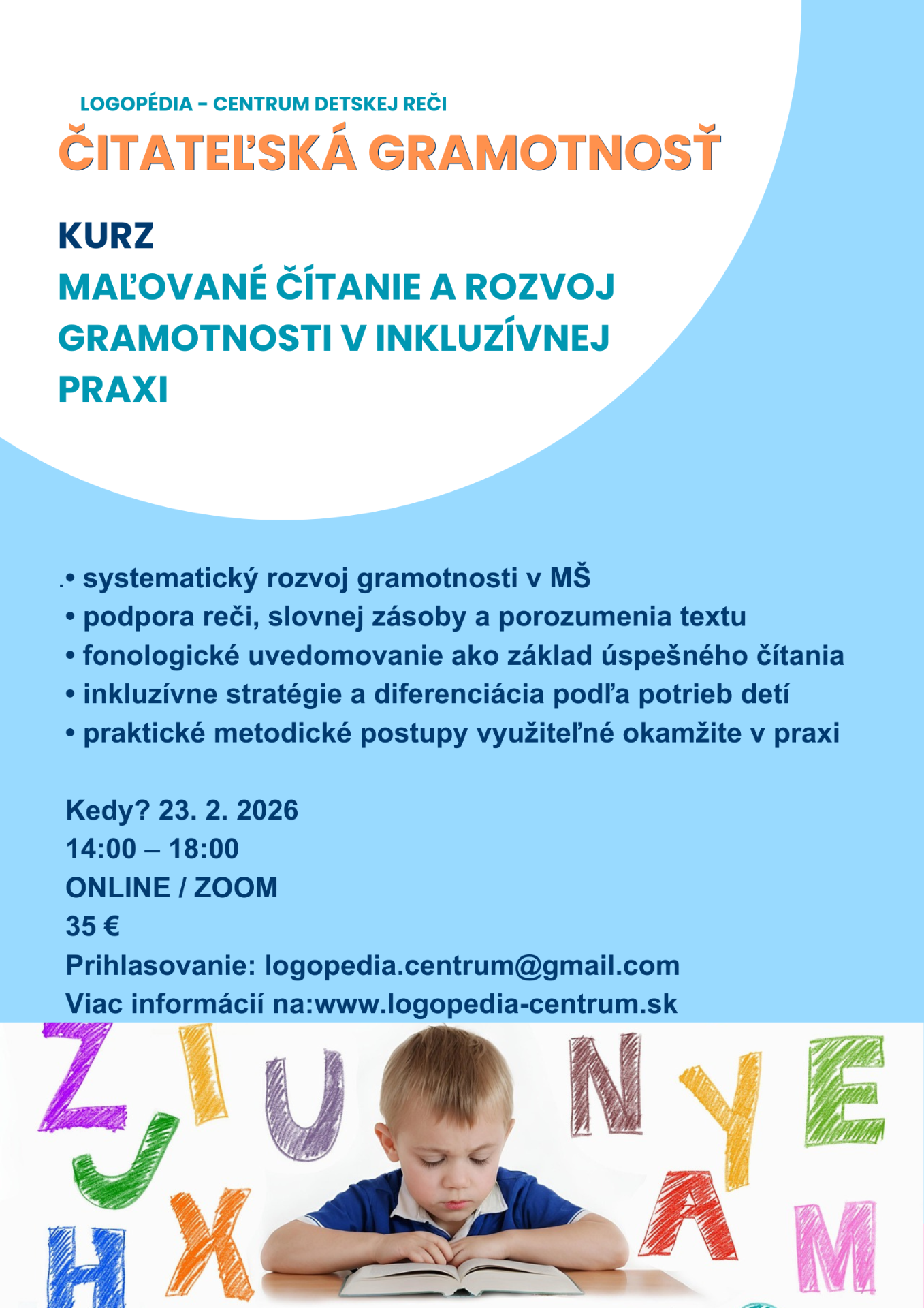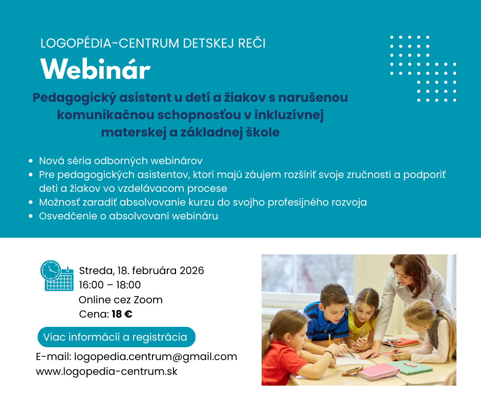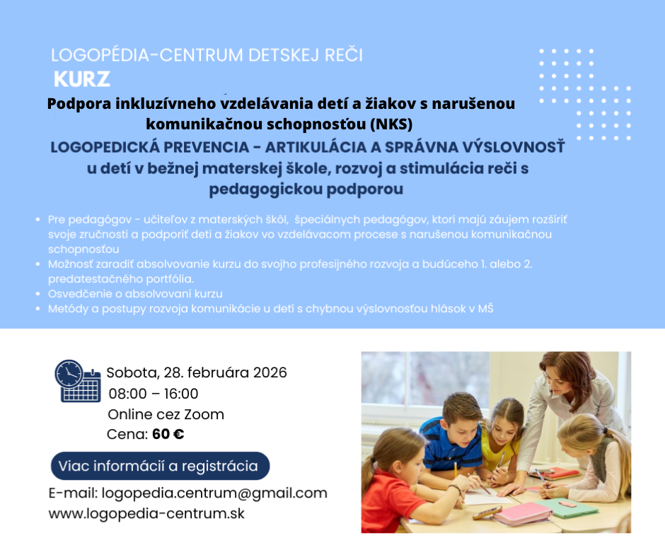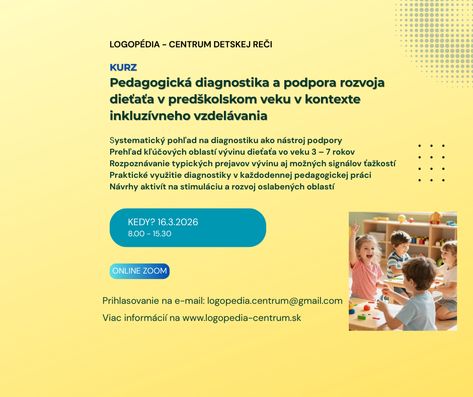 Aktuálny termín kurzu: 21.3.2026 v sobotu od 8.00 hod. do 16.00 hod./ miesto ONLINE, ZOOM, / max. 10 miest / prihlasovanie otvorené Prihlasovanie e-mailom na logopedia.centrum@gmail.com