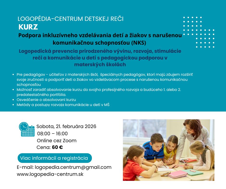 Kurz nie je zaradený medzi inovačné, aktualizačné ani rekvalifikačné vzdelávanie MPSVR SR, no podporuje rozvoj inkluzívneho vzdelávania detí a žiakov s narušenou komunikačnou schopnosťou (NKS). Získané poznatky využijete v pedagogickej praxi, pri tvorbe 1. alebo 2. atestačného portfólia aj vo svojom profesijnom rozvoji. Kurz má charakter odborného vzdelávacieho seminára. Organizátor nie je poskytovateľom akreditovaného vzdelávania podľa zákona o pedagogických zamestnancoch. Účastníci získajú potvrdenie o absolvovaní vzdelávacej aktivity.